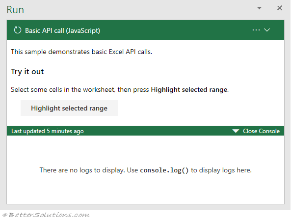 In the "Basic API call (JavaScript)" sample, the address of the cells selected is written to the console at the end.
