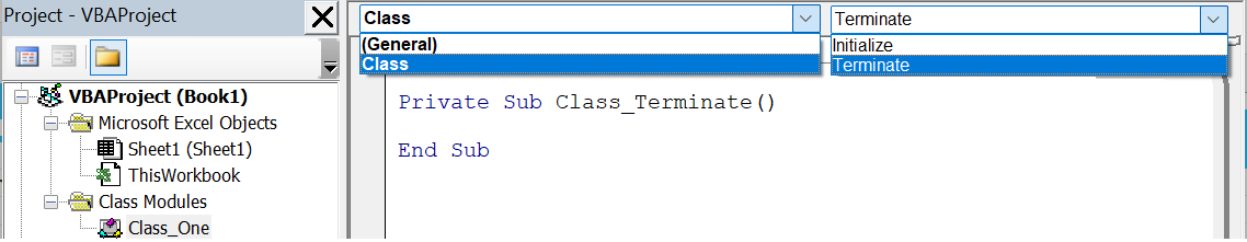 To add this event choose Class from the top left drop-down and then Terminate from the top right drop-down