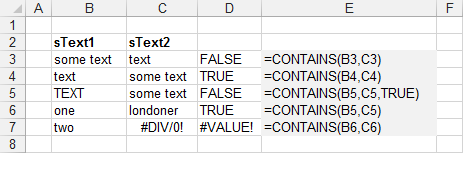 | | A | | 1 | =JS.CONTAINS("text","sometext") | | 2 | =JS.CONTAINS("TEXT","sometext",TRUE) | | 3 | =JS.CONTAINS("TEXT","sometext",FALSE) | | 4 | =JS.CONTAINS("one","londoner") | | 5 | 1 - Does the text "some text" contain the substring "text". |