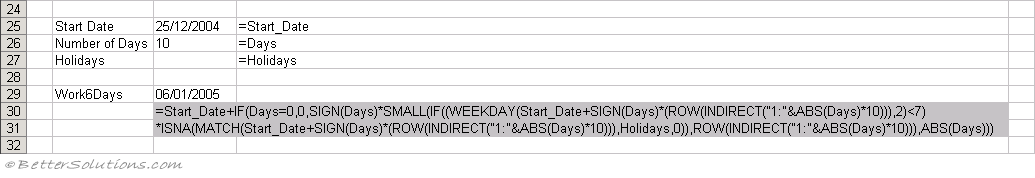 The formula in cell "C3" returns the next working day (assuming a 6 day working week) that is 10 days after 25/12/2004.