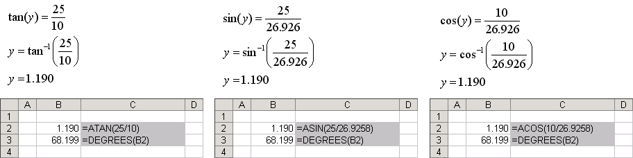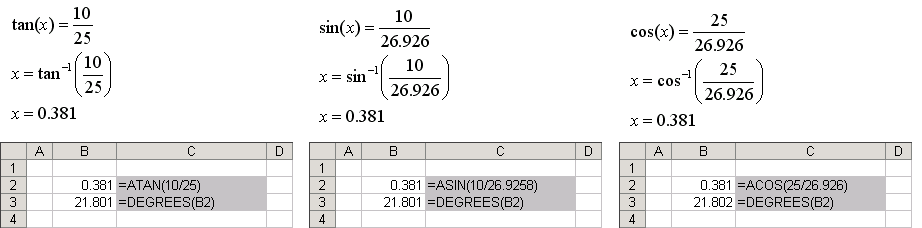 Remember that all the functions return radians so this is converted to degrees in cell "B3".