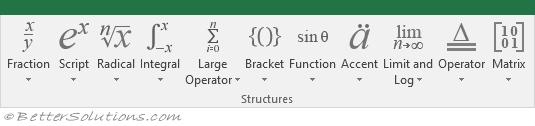 Accent - Drop-Down. Add an accent mark to the equation. The drop-down contains the commands: Accents, Boxed, Formulas, Overbars and Underbars.
