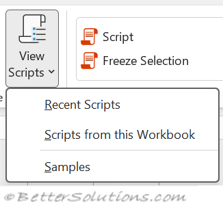 All Scripts - Displays the Office Scripts task pane with the "Recent" tab selected showing you a list of all the previously run scripts.