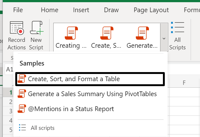 Click on the Office Scripts drop-down to display the Samples.
