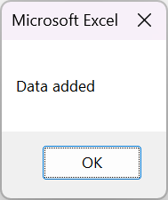When you reopen the workbook you will see a message box appear saying "Data added".